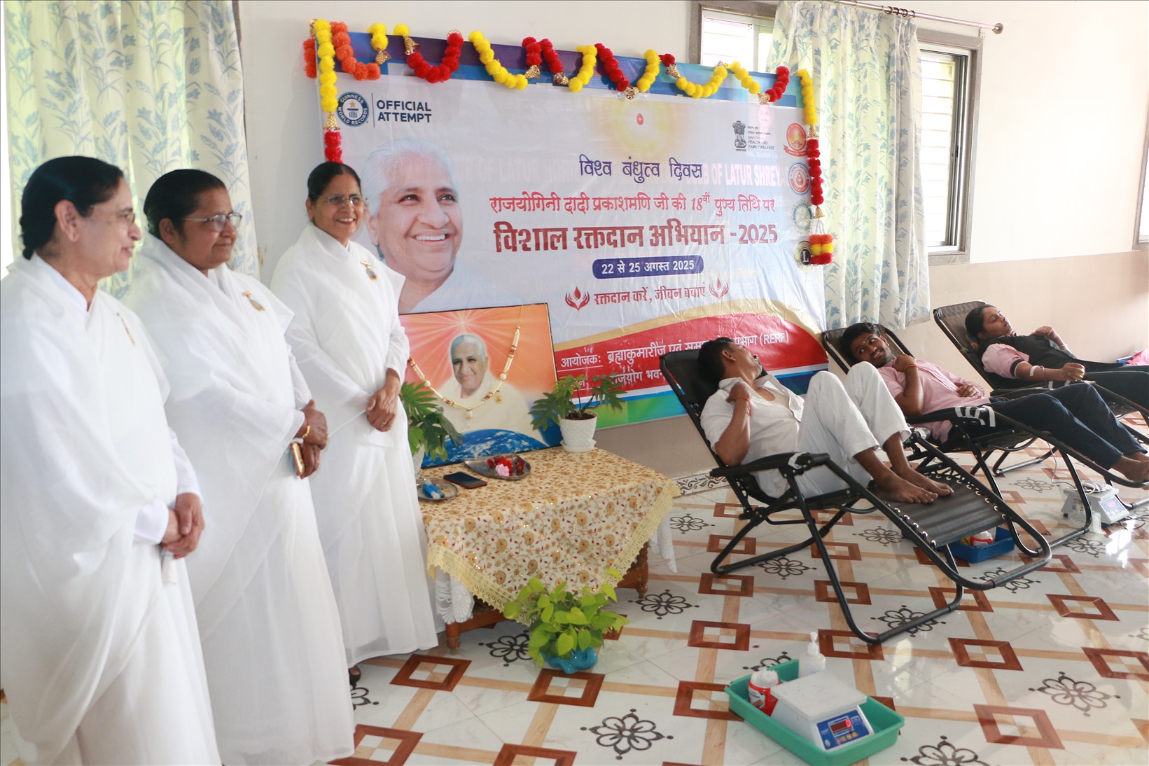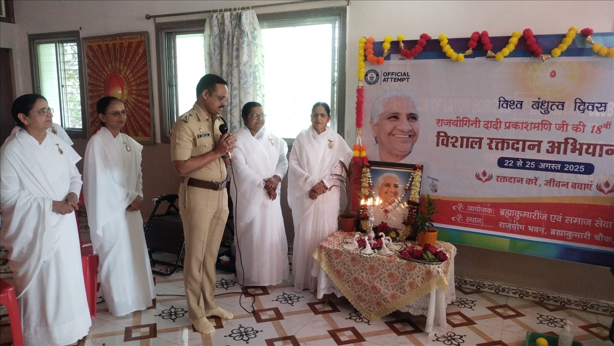 ब्रह्माकुमारीज़ लातूर द्वारा आयोजित ” विश्व बंधुत्व दिवस” के अवसर पर ब्रह्माकुमारीज़ की पूर्व मुख्य प्रशासिका, परम आदरणीय राजयोगिनी ब्रह्माकुमारी डॉ .” दादी प्रकाशमणि जी के 18वीं स्मृति दिवस ” पर चार दिवसीय (२२ से २५ ) विशाल रक्तदान शिविर का आयोजन किया गया | ब्रह्माकुमारीज़ सेवाकेंद्र केंद्र लातूर की संचालिका राजयोगिनी ब्रह्माकुमारी नंदा दीदी के मार्गदर्शन में लातूर शहर के कई कॉलेजेस और औसा , मुरुड सेवाकेंद्रों पर भी रक्तदान शिविर आयोजित किया गया। इस दौरान 300 रक्त दाताओ ने रक्तदान किया।
